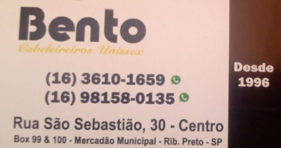 BENTO CABELEIREIROS UNISSEX / Guia Ribeirão Preto SP BENTO CABELEIREIROS UNISSEX Rua São Sebastião, 30 Centro (Mercadão Central Boxes 99 e 100) Telefone 16 – 3610-1659 Cris Whatsapp 16 – 99372-0919 Manicure Facebook = Clique Aqui Ribeirão Preto – SP