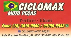 CICLOMAX Moto Peças / Guia Ribeirão Preto SP CICLOMAX MOTO PEÇAS Loja Revendedora de Peças Automotivas e Motocicletas Facebook = Clique Aqui Telefones (16) 3610-0550 Whatsapp 16 – 99190-5988 Rua José Bonifácio, 41 – Centro Ribeirão Preto – SP