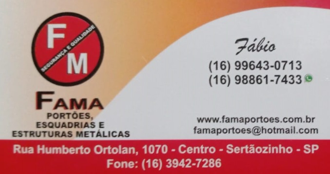 FAMA Portões e Estruturas Metálicas / Guia Sertãozinho SP FAMA Portões e Estruturas Metálicas Especializado em Portões e Estruturas Metálicas famaportoes@hotmail.com Telefones 16 – 3942-7286 / 16 – 99643-0713 e Whatsapp 16 – 98861-7433 Rua Humberto Ortolan, 1070 – Centro Sertãozinho – SP.