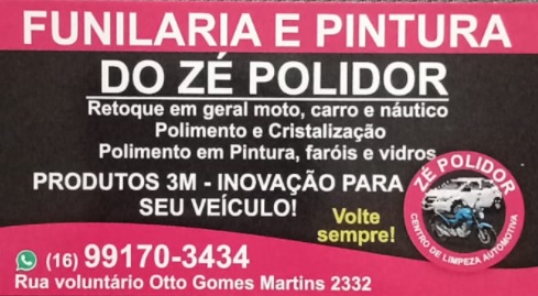 Funilaria e Pintura do Zé Polidor / Guia Sertãozinho SP FUNILARIA E PINTURA DO ZÉ POLIDOR Retoque em Geral: Moto – Carro e Náutico Polimento e Cristalização Polimento em: Pintura – Faróis e Vidros PRODUTOS 3M – INOVAÇÃO PARA SEU VEÍCULO ! CENTRO DE LIMPEZA AUTOMOTIVA Whatsapp: 16 – 99170-3434 Rua Voluntário Otto Gomes Martins, 2332 Sertãozinho – SP