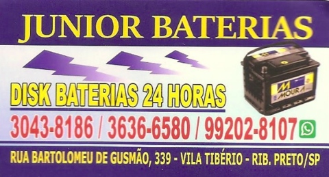 JUNIOR BATERIAS / Guia Ribeirão Preto SP JUNIOR BATERIAS DISK BATERIAS 24 HORAS Borracharia | Troca de Óleo | Estacionamento Rua Bartolomeu Gusmão, 339 Vila Tibério Site: Clique Aqui Telefones 16 – 3636-6580 e Whatsapp 16 – 99202-8107 Ribeirão Preto – SP