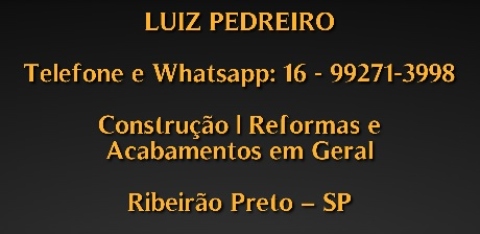 LUIZ PEDREIRO / Guia Ribeirão Preto SP LUIZ PEDREIRO Telefone e Whatsapp: 16 – 99271-3998 Construção | Reformas e Acabamentos em Geral Ribeirão Preto – SP
