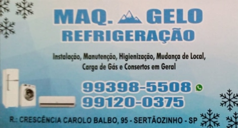 MAQ GELO REFRIGERAÇÃO / Guia Sertãozinho SP MAQ GELO REFRIGERAÇÃO Instalação | Manutenção | Higienização Mudança de Local | Carga de Gás e Consertos em Geral Rua Crescência Carolo Balbo, 95 Telefones 16 – 99120-0375 e Whatsapp 16 – 99398-5508 Sertãozinho – SP