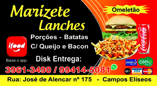 MARIZETE LANCHES | Guia Ribeirão Preto SP MARIZETE LANCHES Rua José de Alencar nº 175 | Bairro Campos Elíseos Disk Entrega: Telefones 16 – 3961-3490 e Whatsapp 16 – 99414-5081 ifood = Clique Aqui Facebook = Clique Aqui Ribeirão Preto – SP