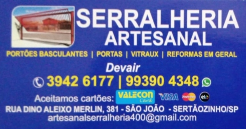 SERRALHERIA ARTESANAL / Guia Sertãozinho SP SERRALHERIA ARTESANAL PORTÕES BASCULANTES | PORTAS VITRAUX | REFORMAS EM GERAL Devair Telefones 16 – 3942-6177 e Whatsapp 16 – 99390-4348 artesanalserralheria400@gmail.com Rua Dino Aleixo Merlin, 381 São João Sertãozinho – SP